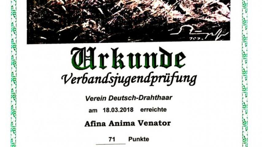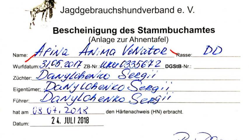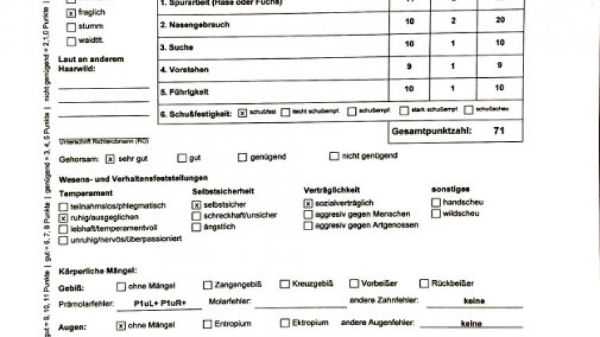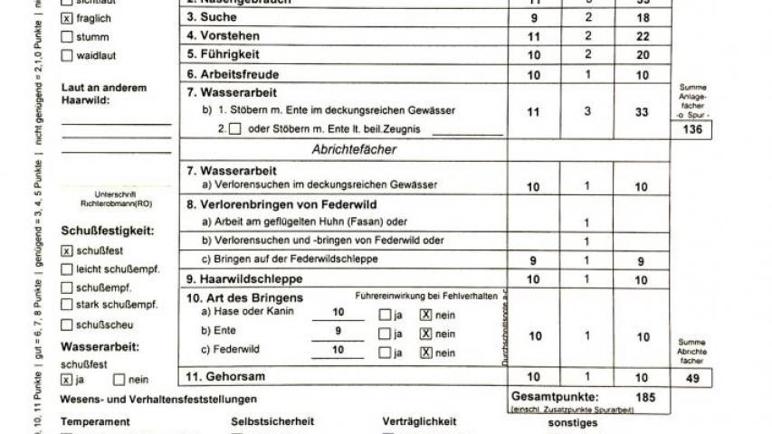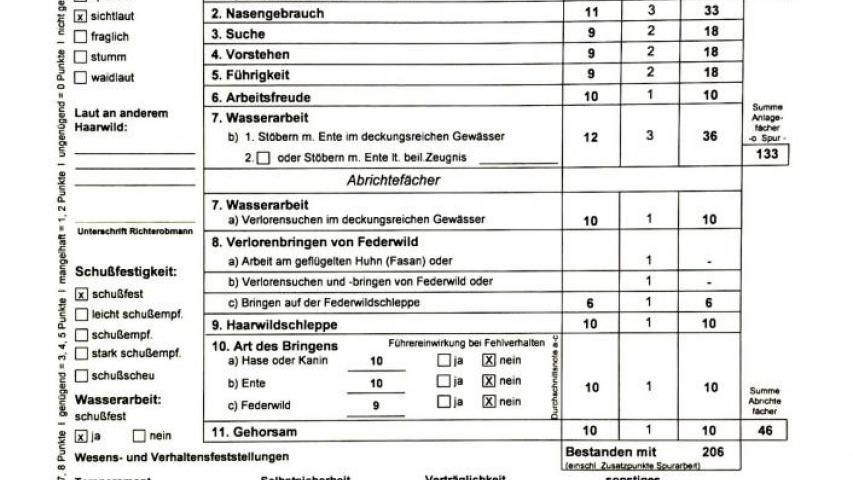 Розцінки по ДИСЦИПЛІНАМ: слідова робота (по сліду зайця) - 9, чуття- 11, пошук - 9, стійка - 9, контактність (керованість) - 9, бажання працювати - 10, робота на воді по живій качці - 12, ніс на воді-12, пошук і подача з міцного місця -10 розшук і подача птиці -6 подача звірка з волока - 10 манера подачі - 10 Послух - 10. Експерти оцінили роботу на воді, як ФЕНОМЕНАЛЬНА найвищі бали. HD - frei, OCD - frei, ED - frei.