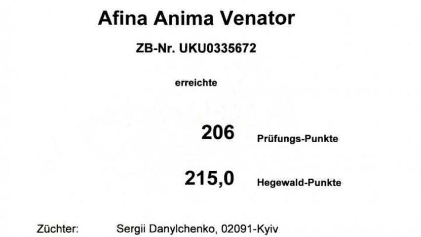 3. Hegewald - 215 Punkte (Form und Haarwert - SG-9 / SG-9, оцінка в 16мес.) Spl / Sil робота з голосом по сліду та переслідування звірка з голосом (по зрячому), який тікає.