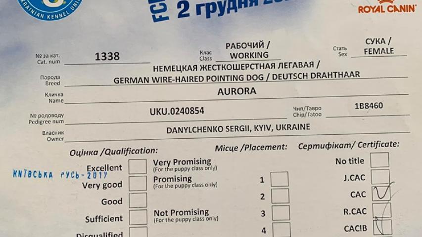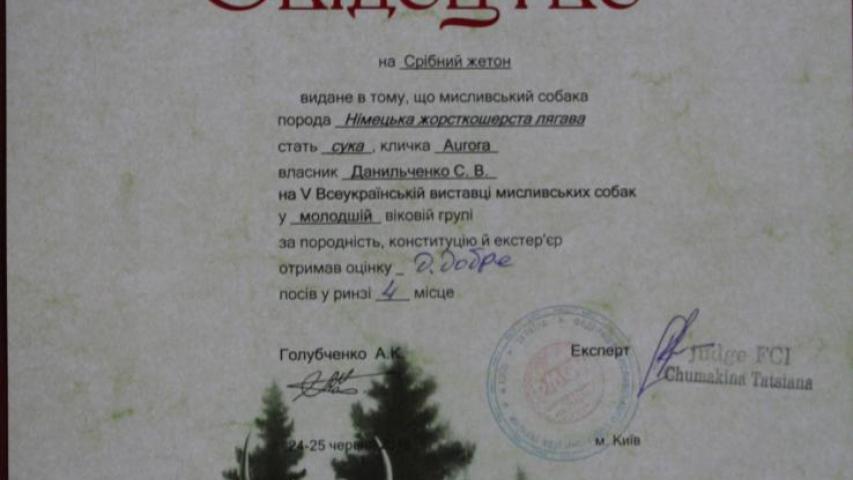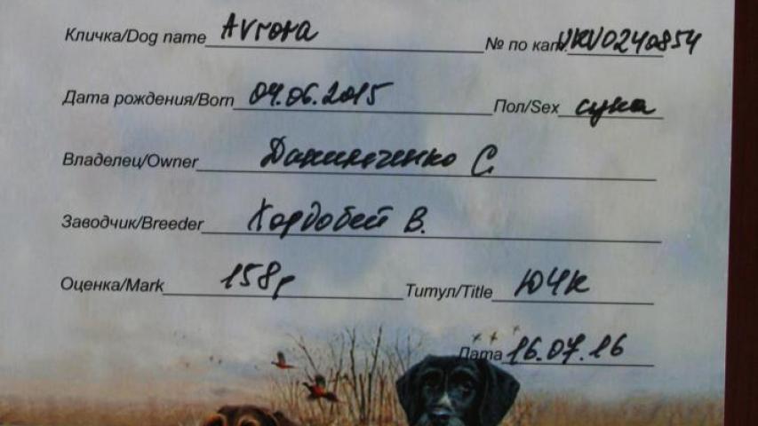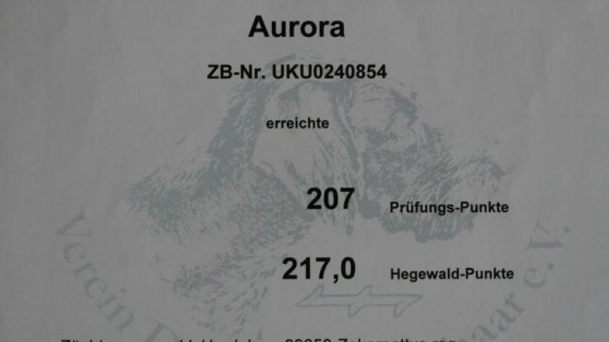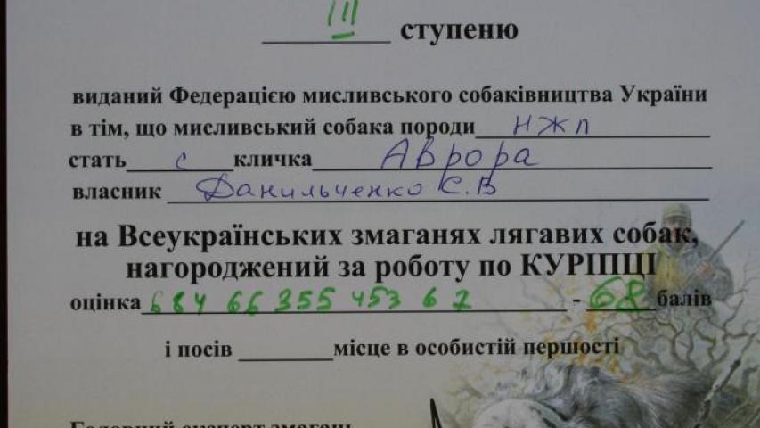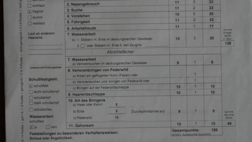 РАСЦЕНКА ПО ДИСЦИПЛИНАМ: следовая работа (по следу зайца) - 10 чутье - 10 поиск - 10 стойка - 9 контактность (управляемость) - 11 желание работать - 11 работа на воде поиск потерянной птицы - 11 поиск и подача из крепкого места - 4 розыск и подача птицы - 10 подача зверька с волока - 10 манера подачи - 10 Послушание - 9 HD - A, OCD - frei, ED - frei.